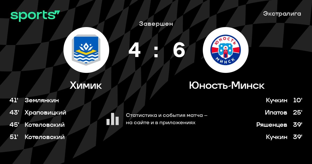 В прошедшем матче в рамках турнира Экстралига состоялась встреча команд Химик - Юность-Минск в городе Новополоцк (Беларусь) на стадионе Дворец культуры и спорта (вместимость - 1200)