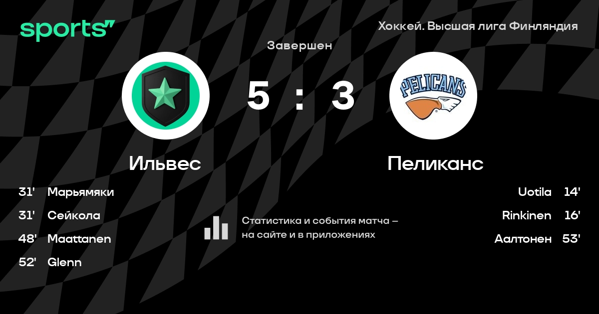 В прошедшем матче в рамках турнира Хоккей. Высшая лига Финляндия состоялась встреча команд Ильвес - Пеликанс со счетом 5 : 3.