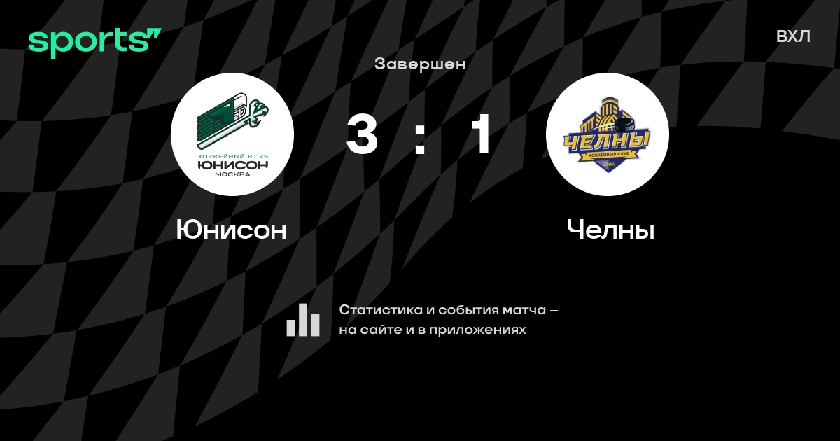 В прошедшем матче в рамках турнира ВХЛ состоялась встреча команд Юнисон - Челны в городе на стадионе VTB Arena,malaya arena со счетом 3 : 1.