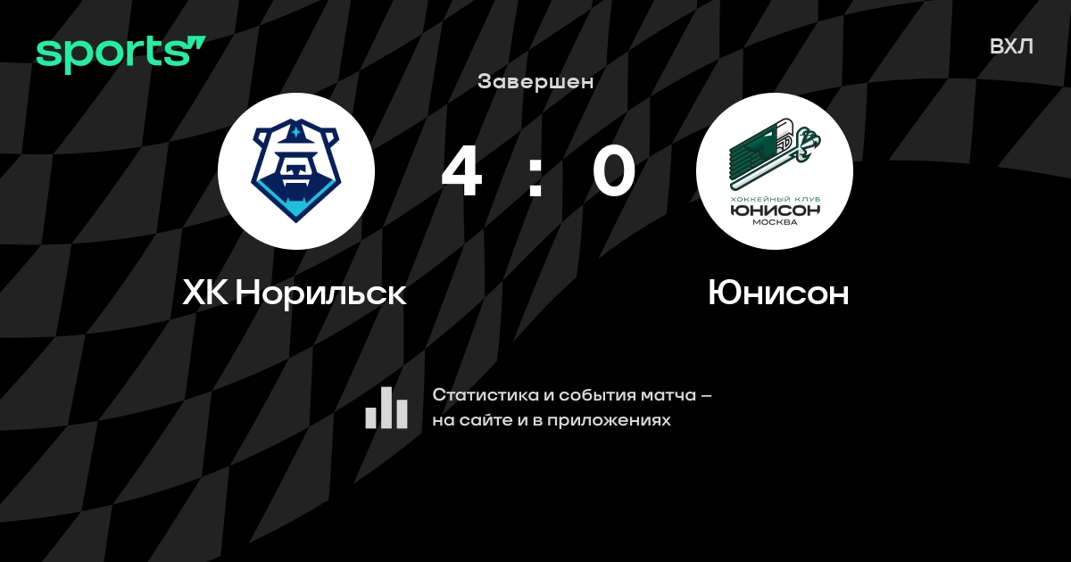 В прошедшем матче в рамках турнира ВХЛ состоялась встреча команд ХК Норильск - Юнисон в городе на стадионе Dvorets Sporta Arktika со счетом 4 : 0.