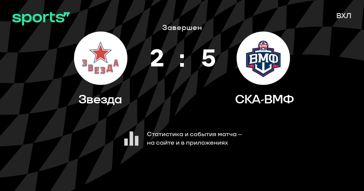 В прошедшем матче в рамках турнира ВХЛ состоялась встреча команд Звезда - СКА-ВМФ в городе Москва (Россия) на стадионе ЦСКА-Арена со счетом 2 : 5.