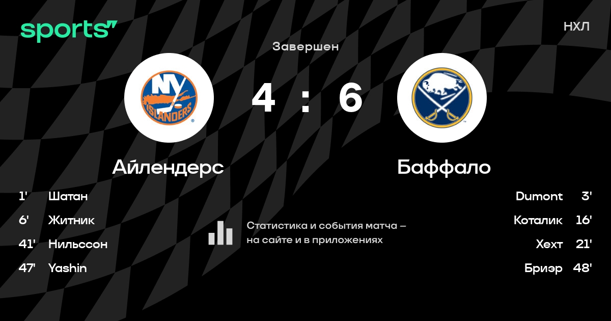 В прошедшем матче в рамках турнира НХЛ состоялась встреча команд Айлендерс - Баффало в городе Uniondale, NY на стадионе Nassau Coliseum со счетом 4 : 6.