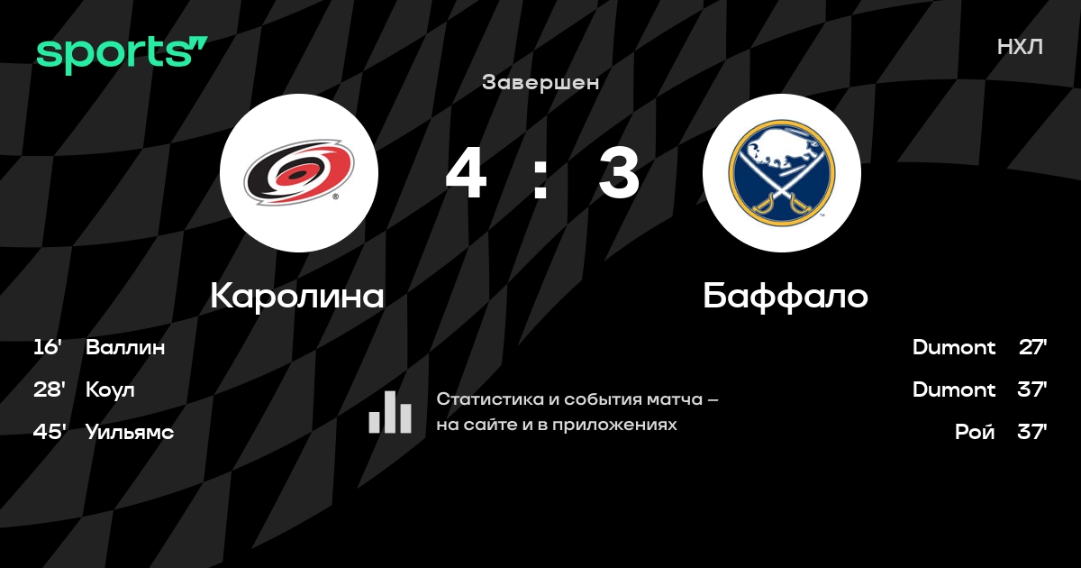 В прошедшем матче в рамках турнира НХЛ состоялась встреча команд Каролина - Баффало в городе Роли (США) на стадионе PNC Arena (вместимость - 18680) со счетом 4 : 3.