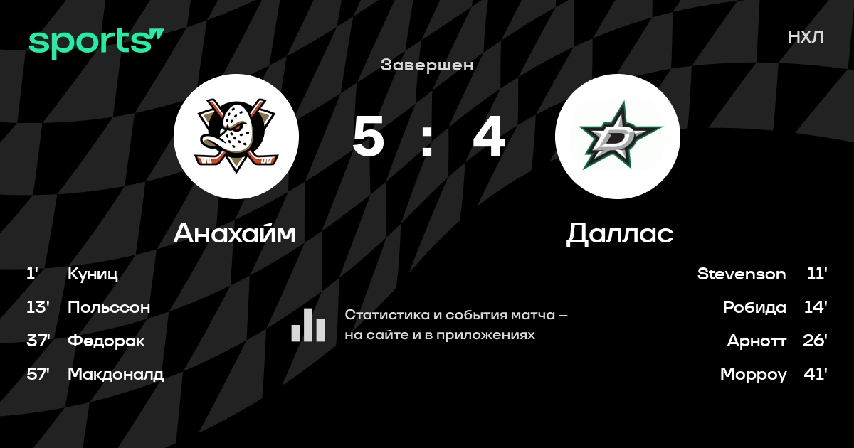 В прошедшем матче в рамках турнира НХЛ состоялась встреча команд Анахайм - Даллас в городе Анахайм (США) на стадионе Honda Center (вместимость - 17174) со счетом 5 : 4.