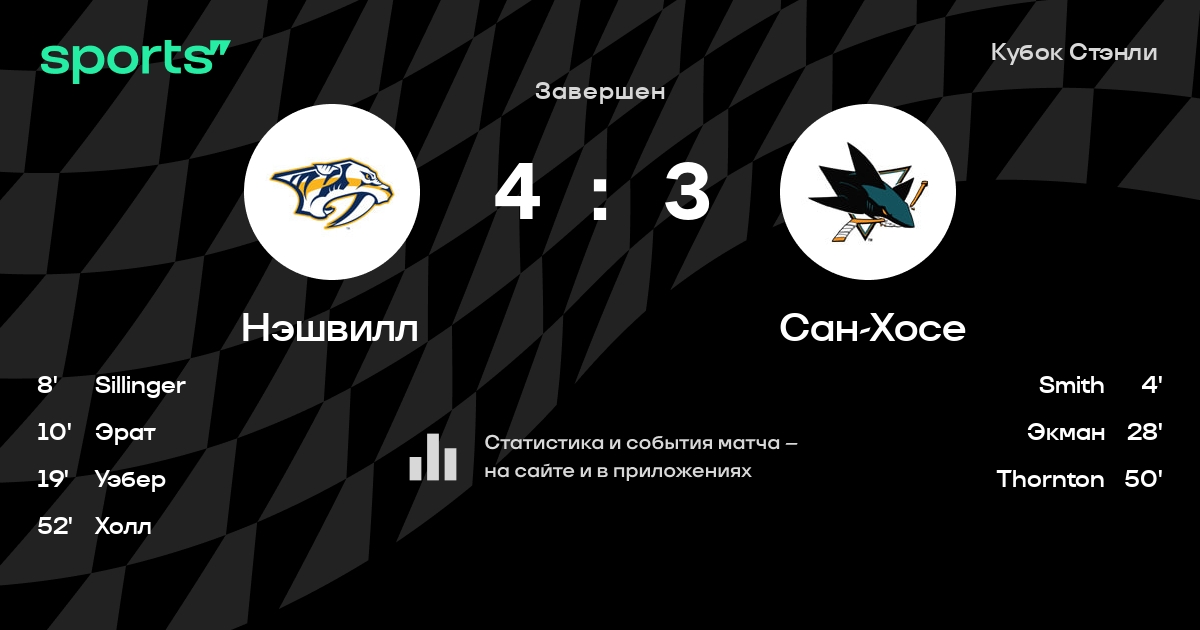 В прошедшем матче в рамках турнира Кубок Стэнли состоялась встреча команд Нэшвилл - Сан-Хосе в городе Нэшвилл (США) на стадионе Bridgestone Arena (вместимость - 17113)