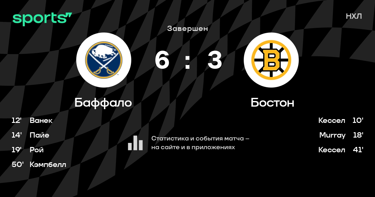В прошедшем матче в рамках турнира НХЛ состоялась встреча команд Баффало - Бостон в городе Баффало (США) на стадионе KeyBank Center (вместимость - 18690) со счетом 6 : 3.