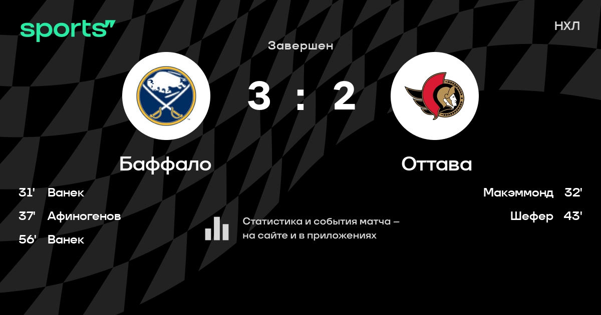 В прошедшем матче в рамках турнира НХЛ состоялась встреча команд Баффало - Оттава в городе Баффало (США) на стадионе KeyBank Center (вместимость - 18690) со счетом 3 : 2.