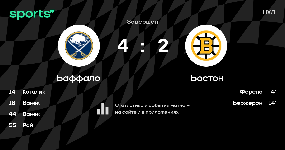 В прошедшем матче в рамках турнира НХЛ состоялась встреча команд Баффало - Бостон в городе Баффало (США) на стадионе KeyBank Center (вместимость - 18690) со счетом 4 : 2.