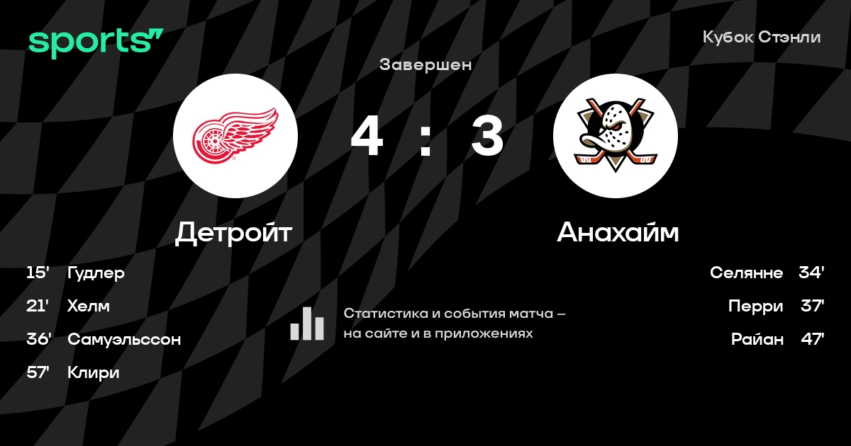 В прошедшем матче в рамках турнира Кубок Стэнли состоялась встреча команд Детройт - Анахайм в городе Детройт на стадионе Joe Louis Arena со счетом 4 : 3.