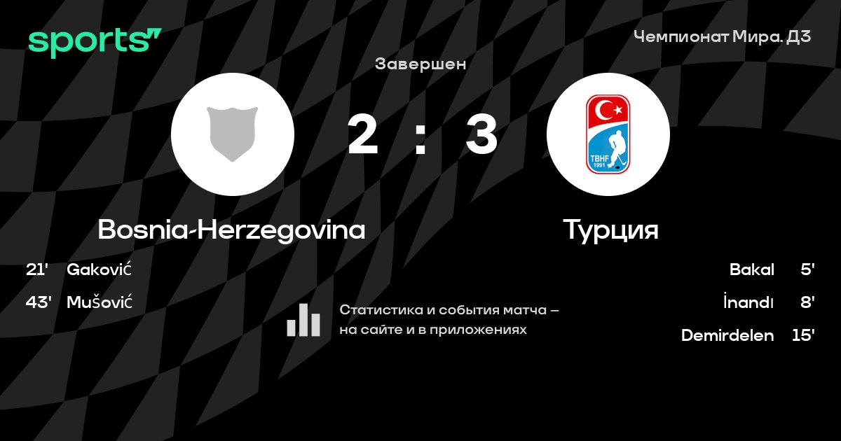 В прошедшем матче в рамках турнира Чемпионат Мира. Д3 состоялась встреча команд Bosnia-Herzegovina - Турция в городе на стадионе Zeytinburnu Buz Pisti