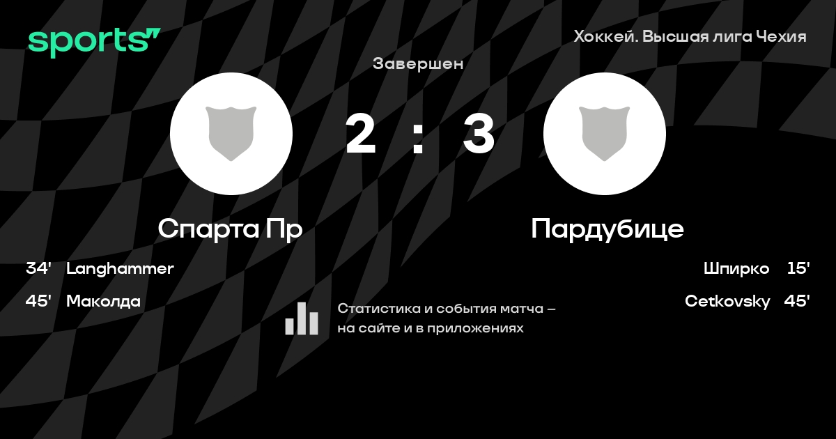 В прошедшем матче в рамках турнира Хоккей. Высшая лига Чехия состоялась встреча команд Спарта Пр - Пардубице со счетом 2 : 3.