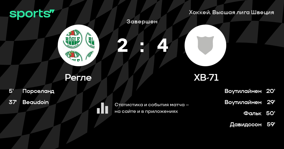 В прошедшем матче в рамках турнира Хоккей. Высшая лига Швеция состоялась встреча команд Регле - ХВ-71 со счетом 2 : 4.
