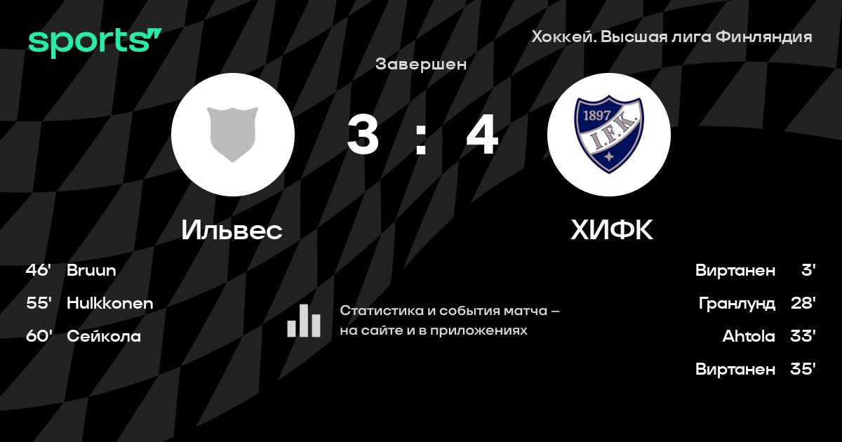 В прошедшем матче в рамках турнира Хоккей. Высшая лига Финляндия состоялась встреча команд Ильвес - ХИФК со счетом 3 : 4.