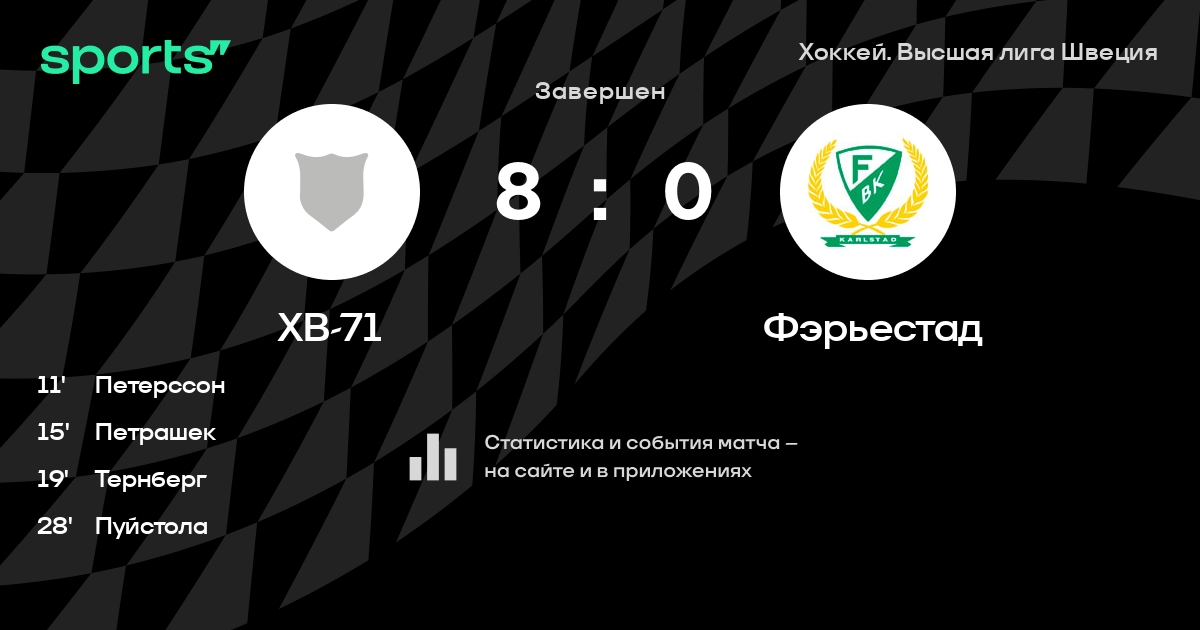 В прошедшем матче в рамках турнира Хоккей. Высшая лига Швеция состоялась встреча команд ХВ-71 - Фэрьестад со счетом 8 : 0.