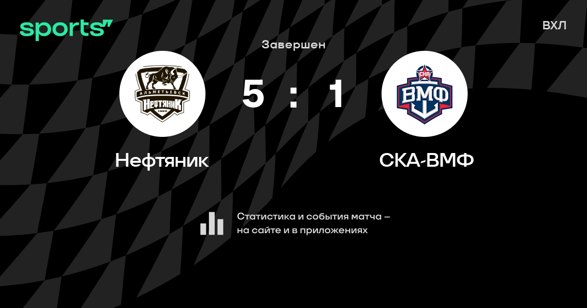 В прошедшем матче в рамках турнира ВХЛ состоялась встреча команд Нефтяник - СКА-ВМФ в городе на стадионе Dvorets Sporta Yubileynyy со счетом 5 : 1.