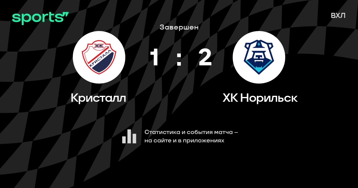 В прошедшем матче в рамках турнира ВХЛ состоялась встреча команд Кристалл - ХК Норильск в городе на стадионе Ledovyy dvorets sporta Kristall со счетом 1 : 2.