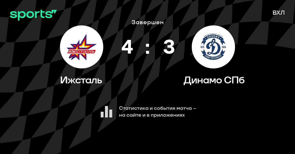 В прошедшем матче в рамках турнира ВХЛ состоялась встреча команд Ижсталь - Динамо СПб в городе на стадионе Ledovyy Dvorets Izhstal со счетом 4 : 3.