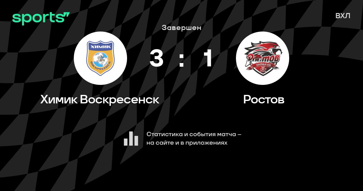 В прошедшем матче в рамках турнира ВХЛ состоялась встреча команд Химик Воскресенск - Ростов в городе на стадионе Podmoskovie Ice Palace со счетом 3 : 1.