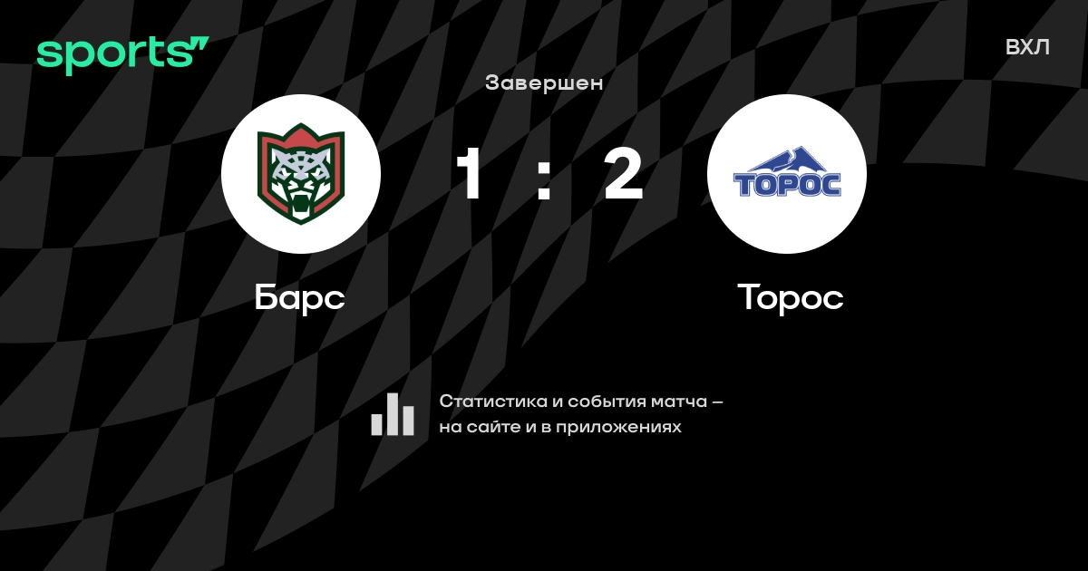 В прошедшем матче в рамках турнира ВХЛ состоялась встреча команд Барс - Торос в городе Казань (Россия) на стадионе Дворец спорта (вместимость - 3523) со счетом 1 : 2.