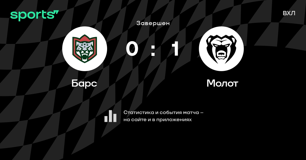 В прошедшем матче в рамках турнира ВХЛ состоялась встреча команд Барс - Молот в городе Казань (Россия) на стадионе Дворец спорта (вместимость - 3523) со счетом 0 : 1.