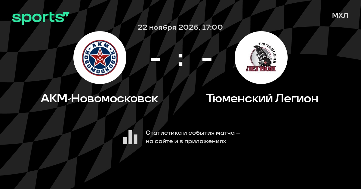 В предстоящем матче в рамках турнира МХЛ пройдет встреча команд АКМ-Новомосковск - Тюменский Легион в городе на стадионе Ledovyy Dvorets Yubileynyy.
