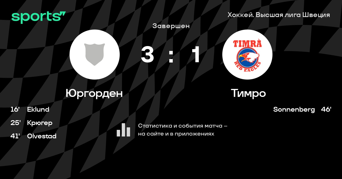 В прошедшем матче в рамках турнира Хоккей. Высшая лига Швеция состоялась встреча команд Юргорден - Тимро со счетом 3 : 1.