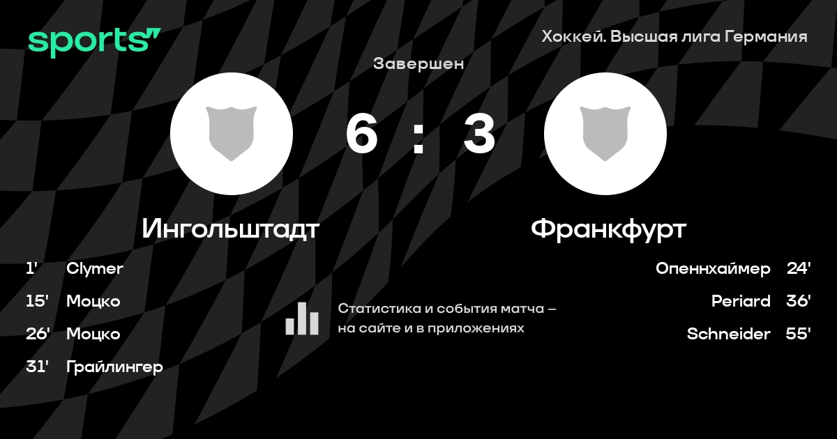 В прошедшем матче в рамках турнира Хоккей. Высшая лига Германия состоялась встреча команд Ингольштадт - Франкфурт со счетом 6 : 3.
