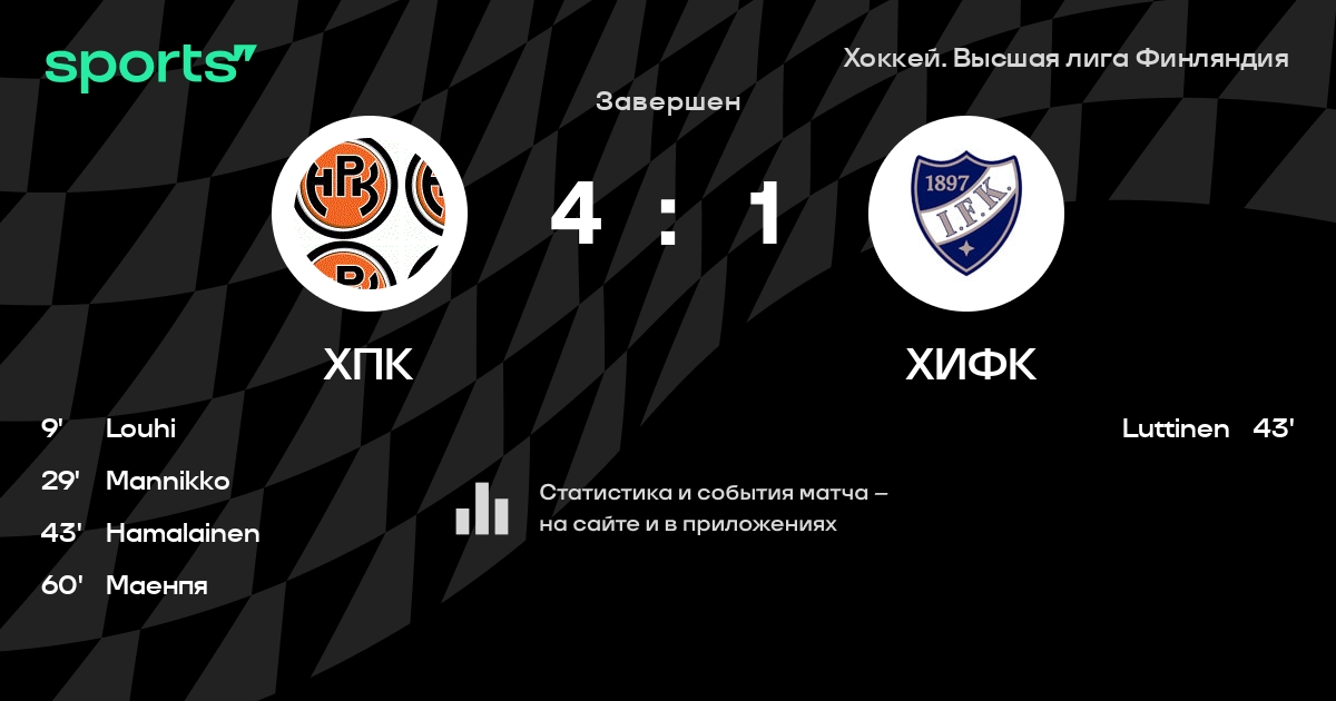 В прошедшем матче в рамках турнира Хоккей. Высшая лига Финляндия состоялась встреча команд ХПК - ХИФК со счетом 4 : 1.