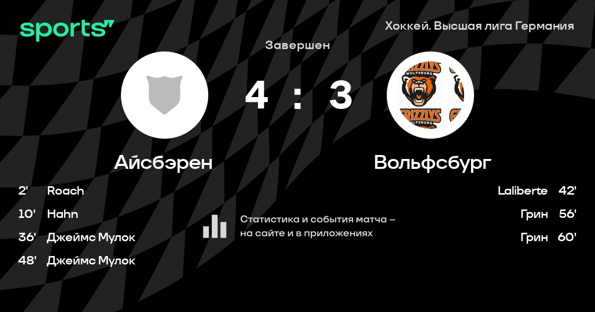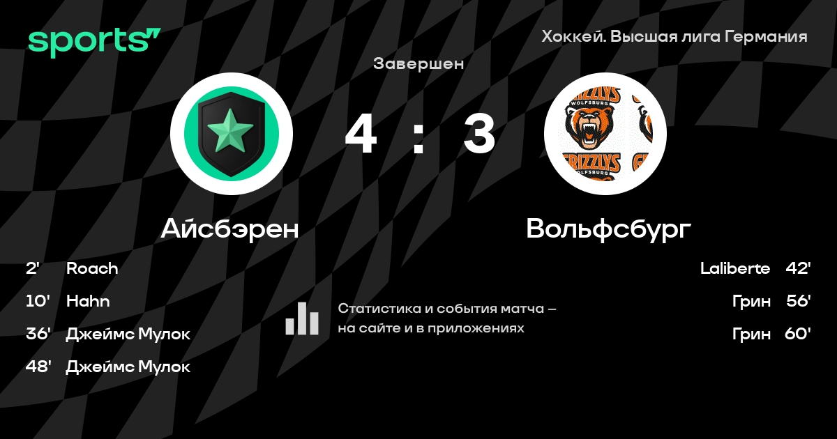 В прошедшем матче в рамках турнира Хоккей. Высшая лига Германия состоялась встреча команд Айсбэрен - Вольфсбург со счетом 4 : 3.