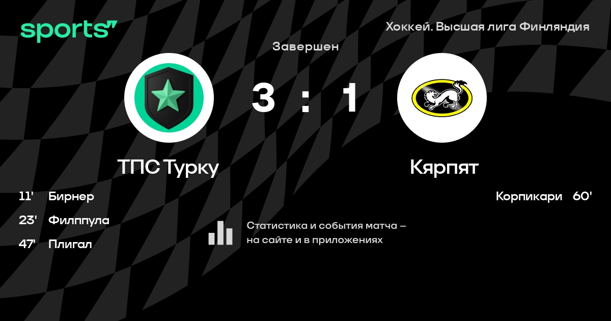 В прошедшем матче в рамках турнира Хоккей. Высшая лига Финляндия состоялась встреча команд ТПС Турку - Кярпят со счетом 3 : 1.