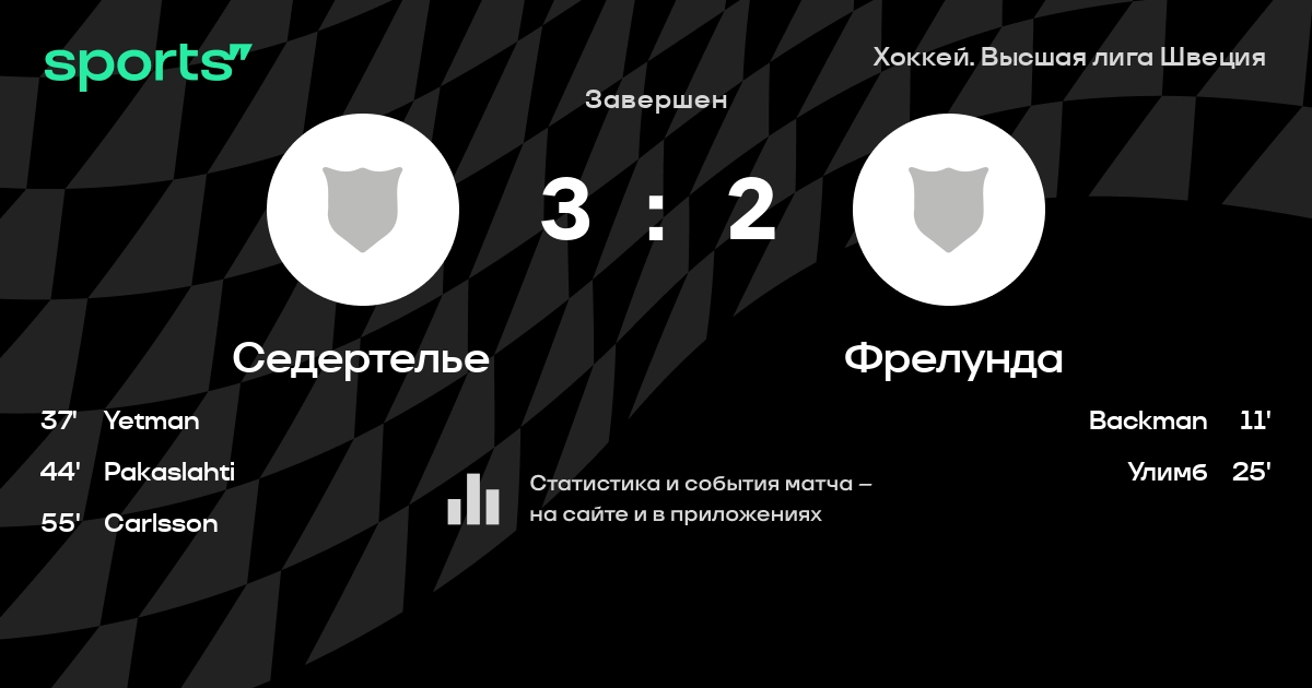В прошедшем матче в рамках турнира Хоккей. Высшая лига Швеция состоялась встреча команд Седертелье - Фрелунда со счетом 3 : 2.