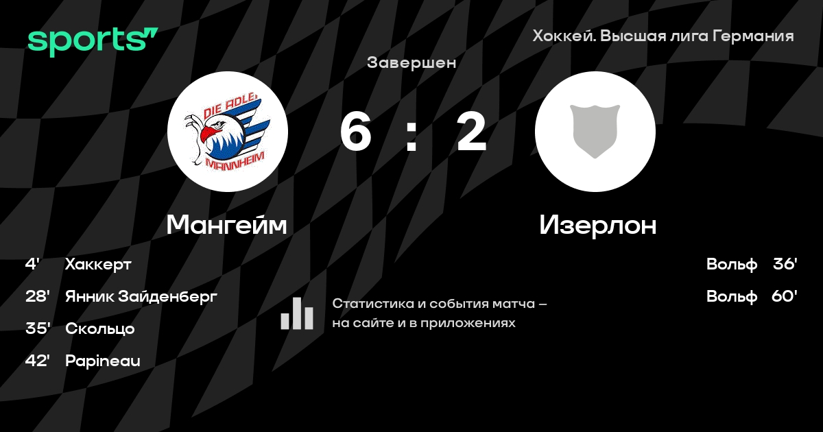 В прошедшем матче в рамках турнира Хоккей. Высшая лига Германия состоялась встреча команд Мангейм - Изерлон со счетом 6 : 2.
