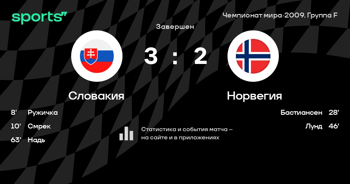 В прошедшем матче в рамках турнира Чемпионат мира-2009. Группа F состоялась встреча команд Словакия - Норвегия со счетом 3 : 2.