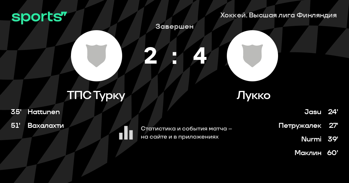 В прошедшем матче в рамках турнира Хоккей. Высшая лига Финляндия состоялась встреча команд ТПС Турку - Лукко со счетом 2 : 4.