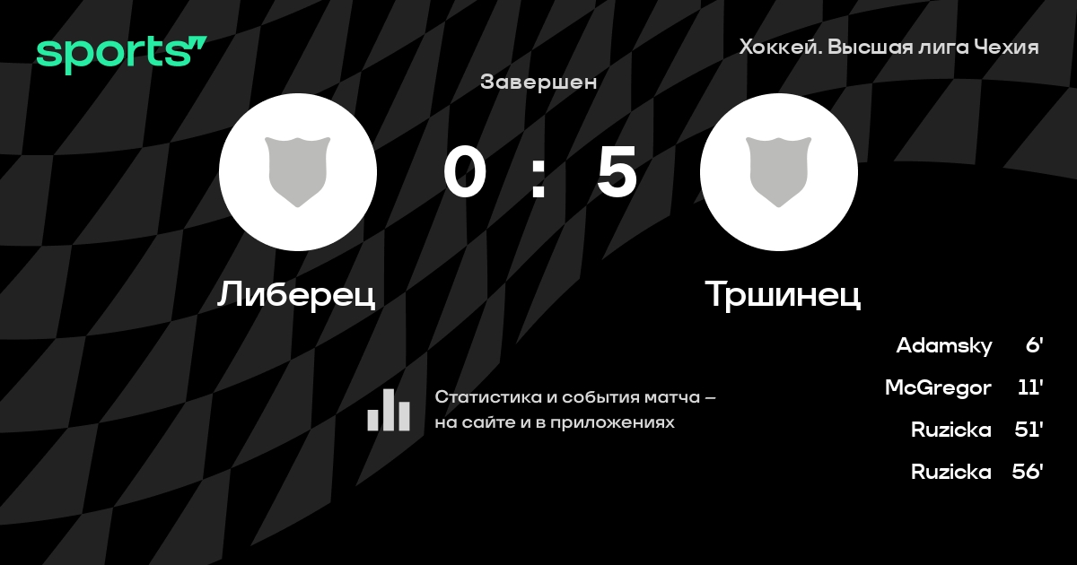 В прошедшем матче в рамках турнира Хоккей. Высшая лига Чехия состоялась встреча команд Либерец - Тршинец со счетом 0 : 5.