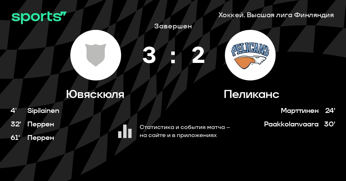В прошедшем матче в рамках турнира Хоккей. Высшая лига Финляндия состоялась встреча команд Ювяскюля - Пеликанс со счетом 3 : 2.