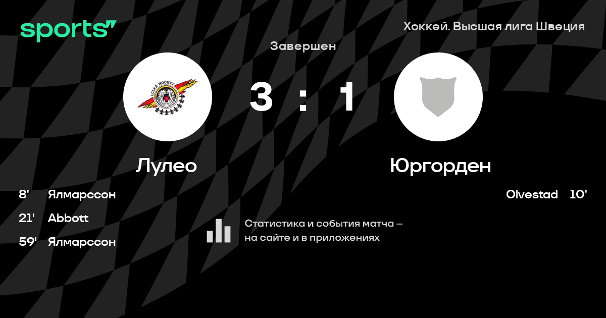 В прошедшем матче в рамках турнира Хоккей. Высшая лига Швеция состоялась встреча команд Лулео - Юргорден со счетом 3 : 1.