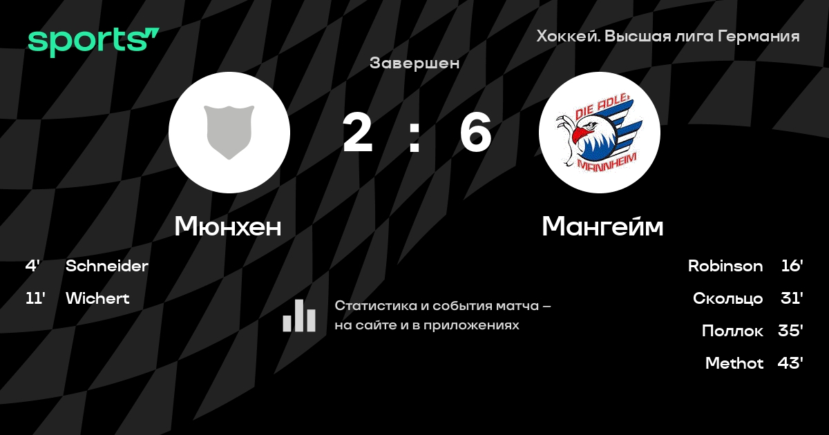В прошедшем матче в рамках турнира Хоккей. Высшая лига Германия состоялась встреча команд Мюнхен - Мангейм со счетом 2 : 6.