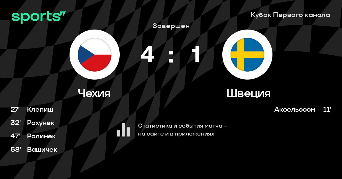 В прошедшем матче в рамках турнира Кубок Первого канала состоялась встреча команд Чехия - Швеция в городе Москва (Россия) на стадионе Ледовый дворец на Ходынке