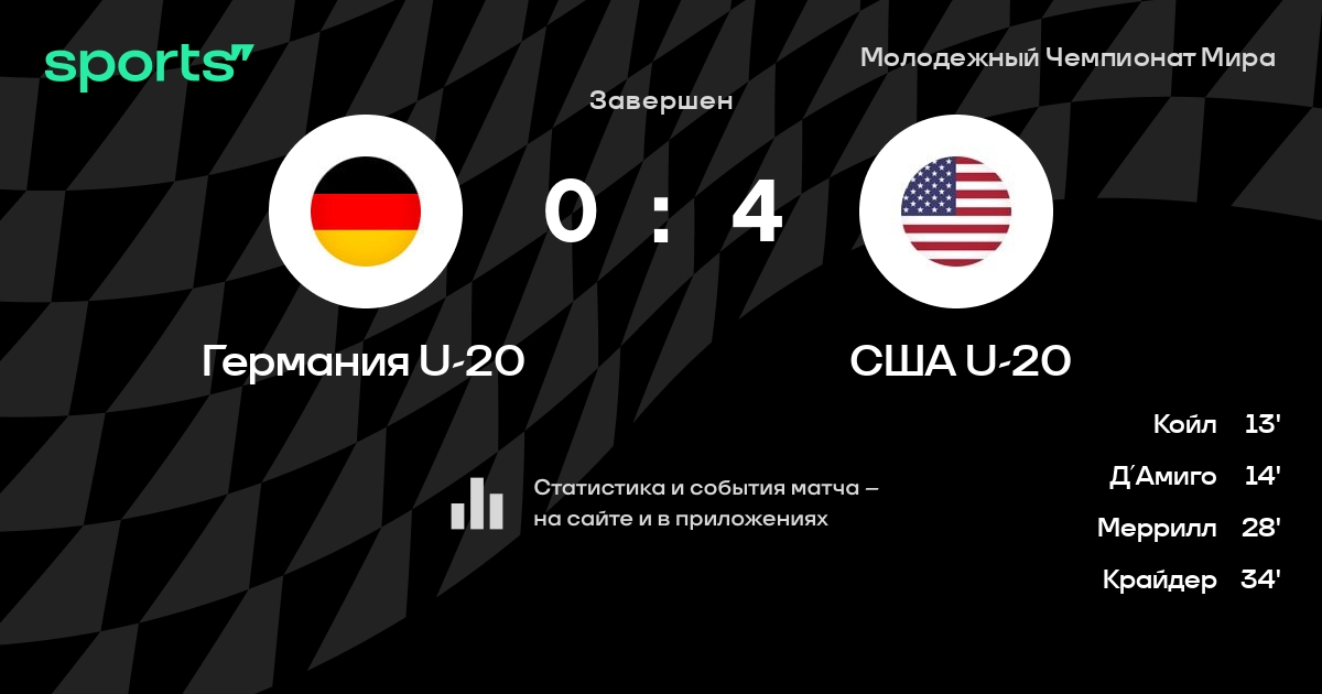 В прошедшем матче в рамках турнира Молодежный Чемпионат Мира Групповой раунд состоялась встреча команд Германия U-20 - США U-20 со счетом 0 : 4.