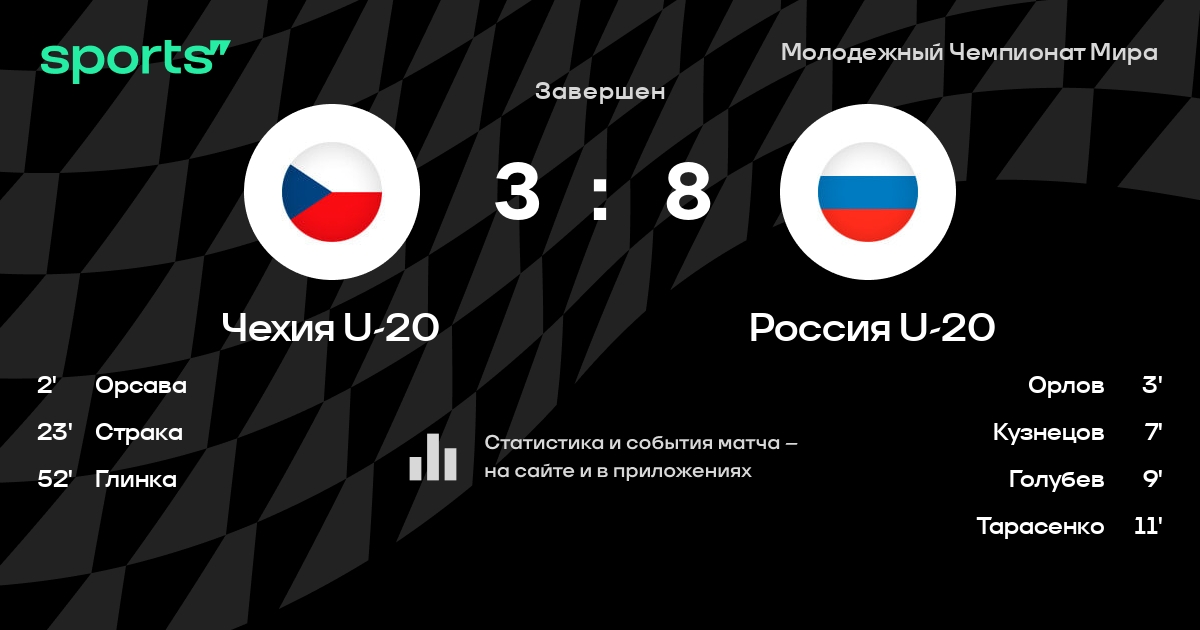 В прошедшем матче в рамках турнира Молодежный Чемпионат Мира Групповой раунд состоялась встреча команд Чехия U-20 - Россия U-20 со счетом 3 : 8.