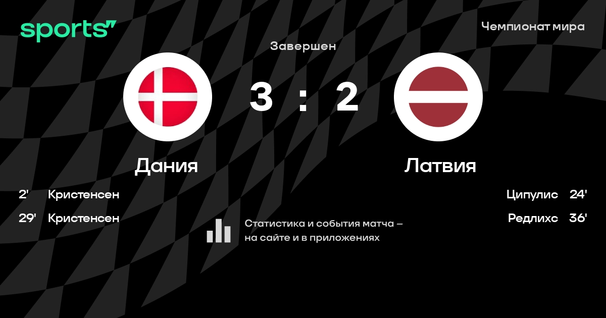 В прошедшем матче в рамках турнира Чемпионат мира Предварительный этап. 3 тур состоялась встреча команд Дания - Латвия со счетом 3 : 2.