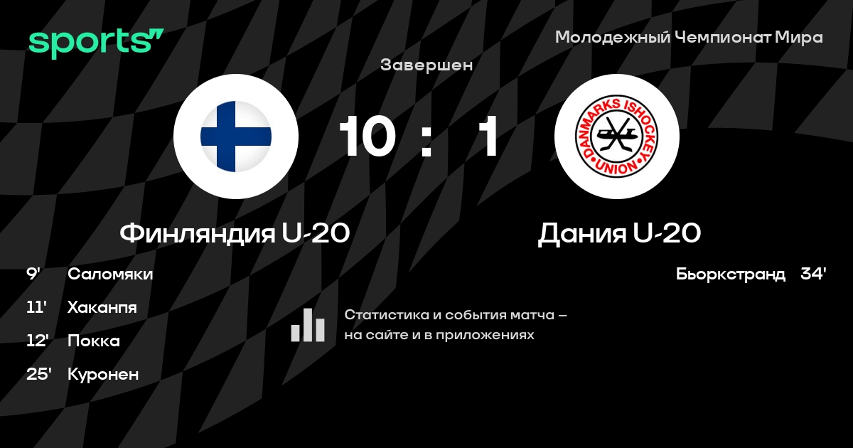 В прошедшем матче в рамках турнира Молодежный Чемпионат Мира Групповой раунд состоялась встреча команд Финляндия U-20 - Дания U-20 со счетом 10 : 1.