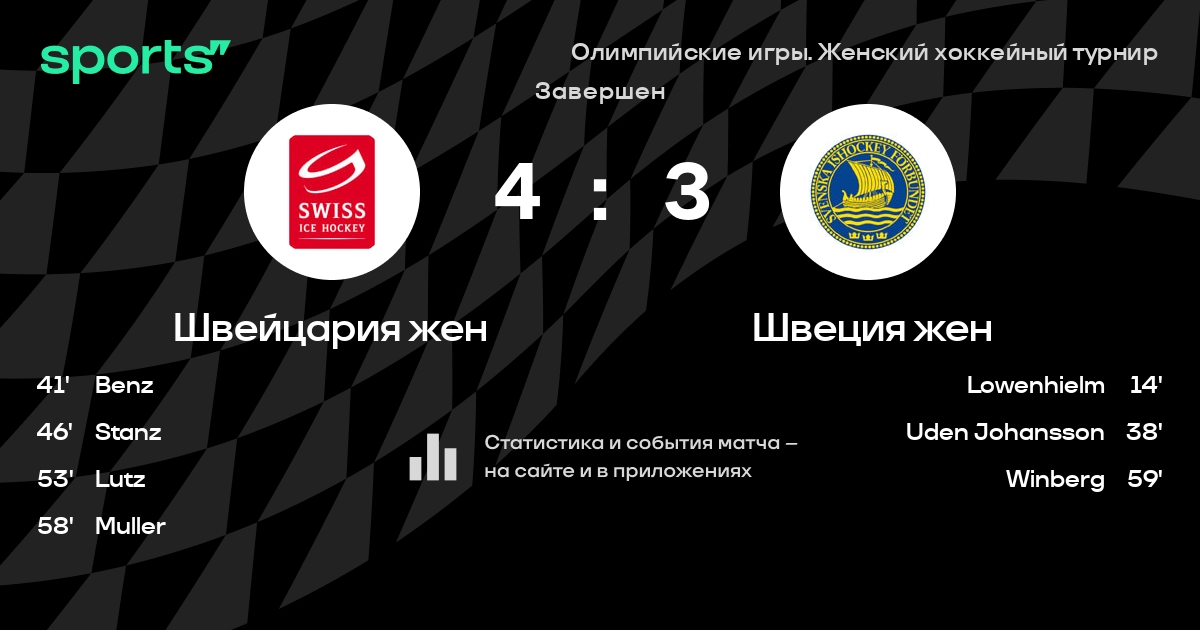 В прошедшем матче в рамках турнира Олимпийские игры. Женский хоккейный турнир состоялась встреча команд Швейцария жен - Швеция жен в городе Сочи (Россия) на стадионе Большой (вместимость - 12000)