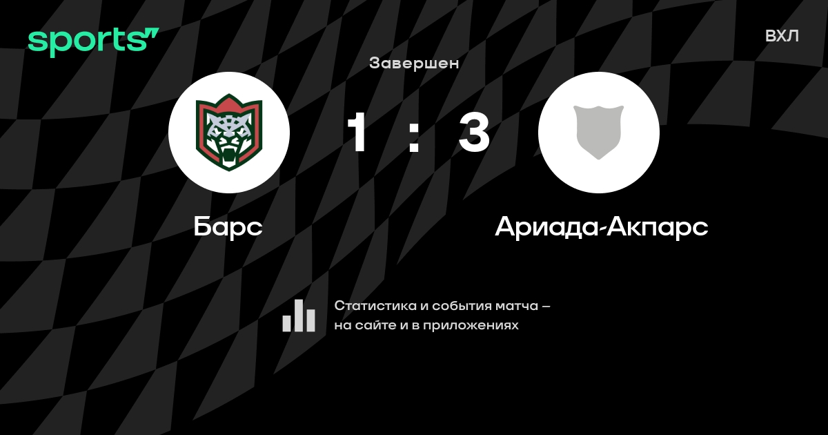 В прошедшем матче в рамках турнира ВХЛ состоялась встреча команд Барс - Ариада-Акпарс со счетом 1 : 3.