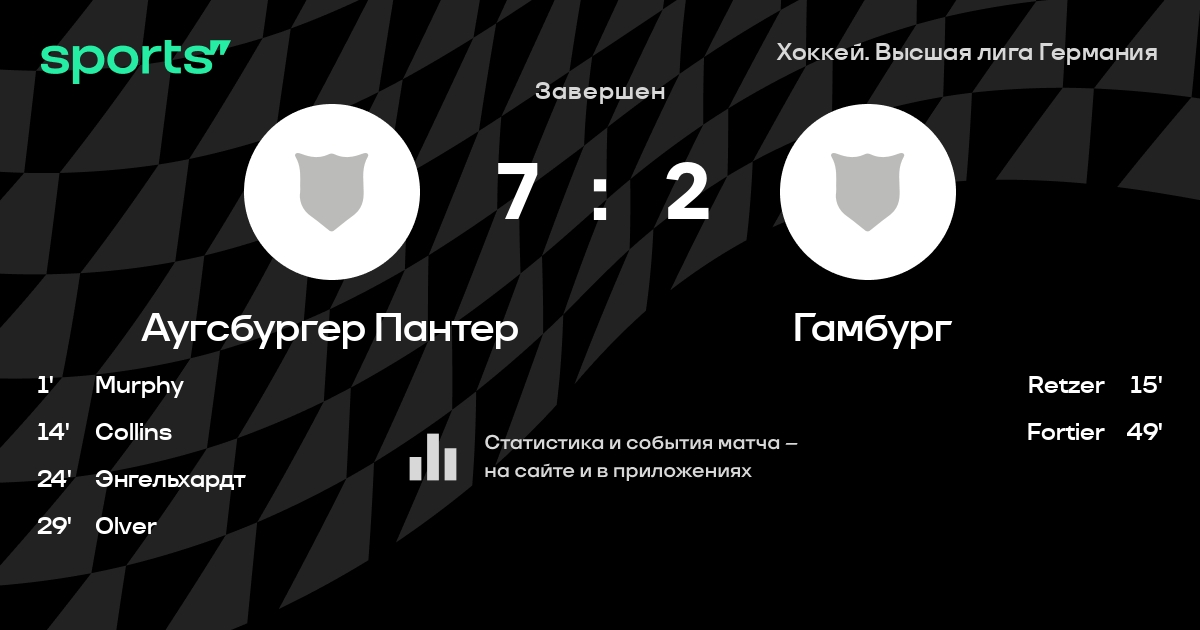 В прошедшем матче в рамках турнира Хоккей. Высшая лига Германия состоялась встреча команд Аугсбургер Пантер - Гамбург со счетом 7 : 2.