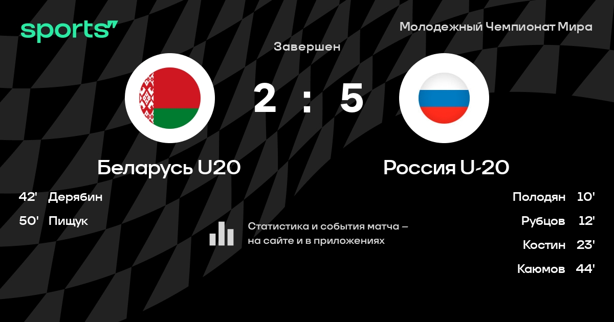 Россия (U-20): Сухачев (Мельничук); Зайцев (К) — Минулин, Манукян — Рубцов — Каюмов; Кныжов — Макеев (А), Алтыбармакян — Мальцев (А) — Полодян; Саморуков — Елизаров, Соколов — Шолохов — Абрамов; Семин — Шепелев, Костин — Иванов — Свечников.