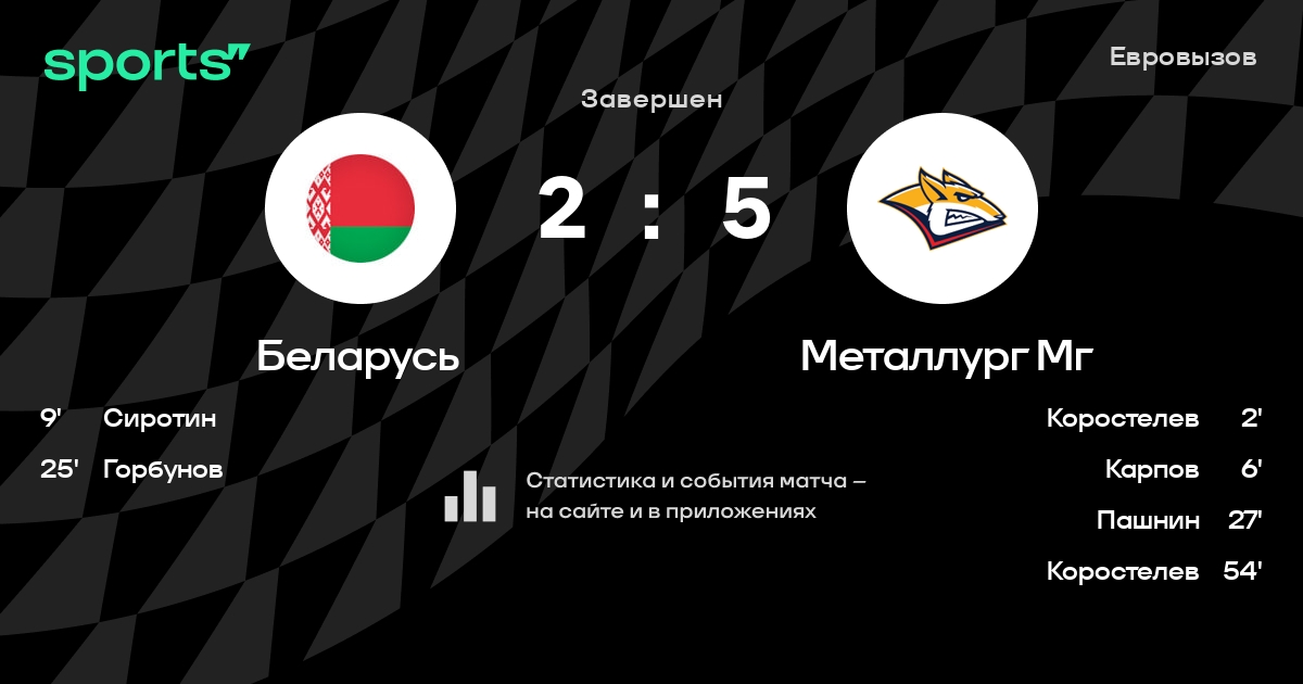 В прошедшем матче в рамках турнира Евровызов состоялась встреча команд Беларусь - Металлург Мг со счетом 2 : 5.