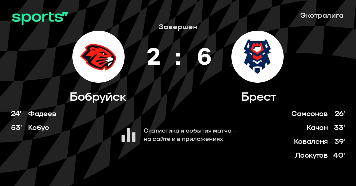 В прошедшем матче в рамках турнира Экстралига состоялась встреча команд Бобруйск - Брест в городе Бобруйск (Беларусь) на стадионе Бобруйск-Арена (вместимость - 7191)