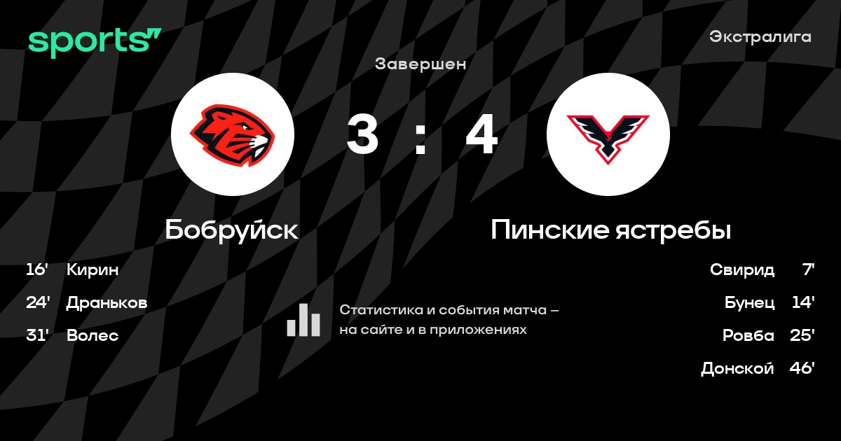 В прошедшем матче в рамках турнира Экстралига состоялась встреча команд Бобруйск - Пинские ястребы в городе Бобруйск (Беларусь) на стадионе Бобруйск-Арена (вместимость - 7191)